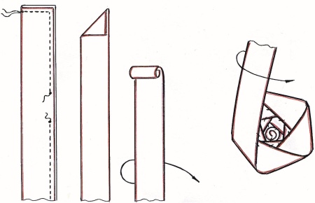 - Then the petals are formed, turning the tape at a right angle, securing the turns with stitches.