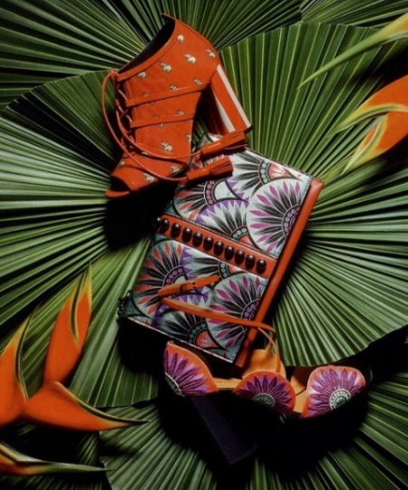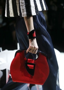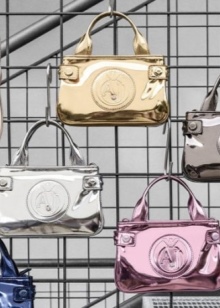 Budget models are made of artificial leather. In addition to these materials, the brand works with textiles. Accessories made of fabric look no less bright and spectacular, they often become a decoration of the image.