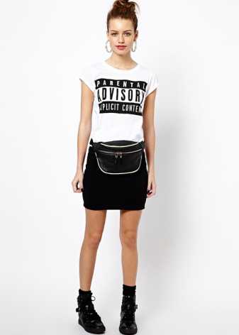 - The tandem of a practical bag and skirt in a female image will be successful. It is recommended to choose loose fit items from light or dense fabrics. It can even be a bright and non-standard pack of air tulle. Upstairs you can put on a pastel-colored blouse and put on comfortable light sneakers. As a result, you will get a wonderful look in the style of sport-chic.