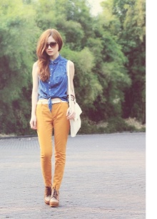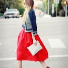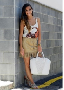 - If you are a happy owner of a slim figure, then you will like the ensemble, assembled from a short denim skirt with a high waist, a light blonde blouse or blouse, complemented by a white shoulder bag with contrasting fittings. A similar image should be formed only by girls.