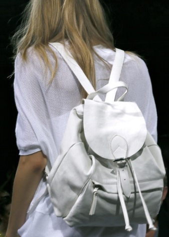 - The trend of this season is a bag-bag (another name is a pouch). In white, it looks very interesting and unusual. In such products, classic locks are replaced by ordinary lacing on the top. If you want to close the bag, then you just need to tighten these laces tight.