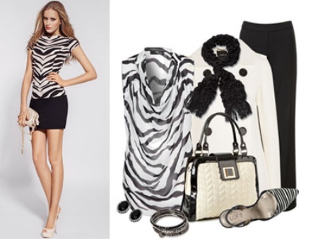 - A set consisting of a light zebra print sleeveless blouse, a black short skirt (can be replaced with trousers), and black and white nosy shoes will look bright and sexy. Upstairs you can put on a white jacket with black buttons and put on a dark neckerchief. A plain white bag or accessory with black accents will harmoniously fit into this ensemble.