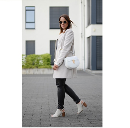 - If the courtyard is cool and windy, then it is quite possible to pick up black leather leggings and a light coat of gray or cream shade with similar boots with a steady heel. Complete the kit with a small shoulder bag with golden fittings and sunglasses.