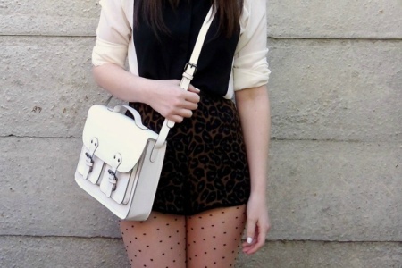 - A tandem of a black and white blouse with a long sleeve and a short leopard skirt in dark tone will look very attractive on a girl. Complement your interesting outfit with tights with a small pattern and a shoulder bag-bag with pockets on the front.