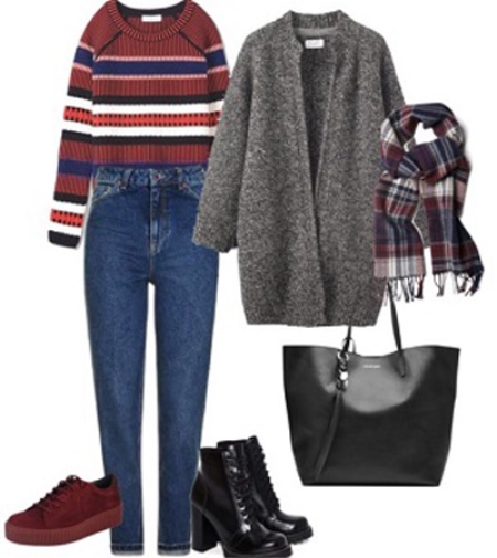- A soft and cozy style can be created with narrow blue jeans, a striped sweater and a long gray cardigan. Decorate your look with a black shopper bag, a plaid scarf, and black patent leather boots.