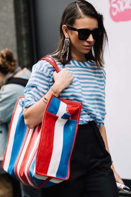 - A set of a striped loose blouse and shortened fitting black trousers will look easy and feminine. Complement it with a large red bag, burgundy sneakers and a large wristwatch.