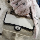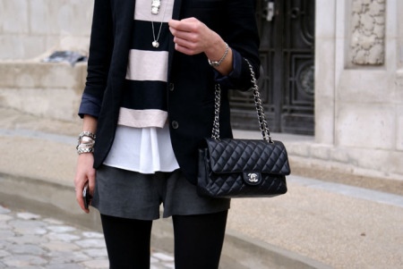 - A traditional Chanel clutch on a chain strap will look great against dark leggings, light gray shorts and a striped tunic made of delicate material. You can complement this set with a black long-sleeve jacket and other accessories: bracelets, rings and chains.