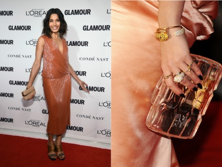 - For a feminine evening look, choose a sexy dress with a golden smell and light sandals, with a wide line on the shaft. Such a simple set can be supplemented with a branded clutch or bag-box, as well as jewelry bracelets and chains. Such an ensemble will look very elegant and playful thanks to shades of gold.