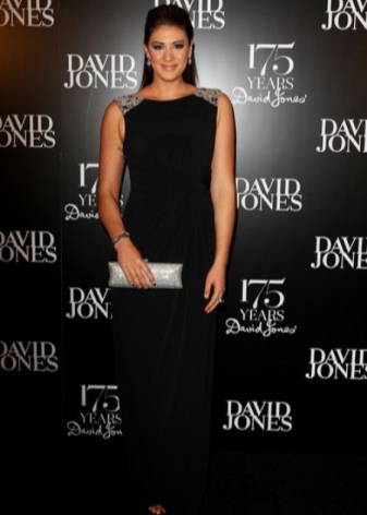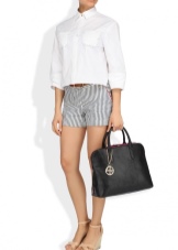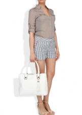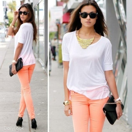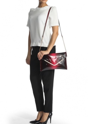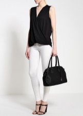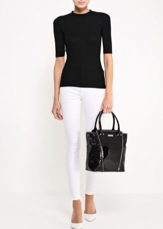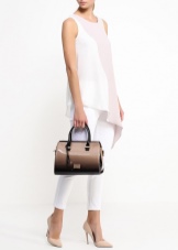 Do not forget about your beloved classics. A small black clutch bag on a thin metal chain looks elegant and rich. It can be safely worn for a gala evening or for every day. The snow-white jacket with a short sleeve and peach trousers are beautifully combined with a black handbag, if you pick up also black high-heeled shoes.