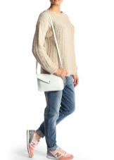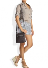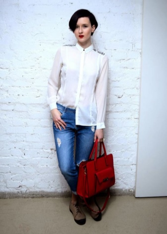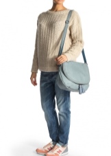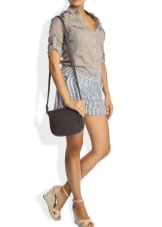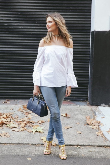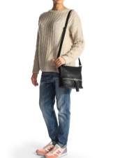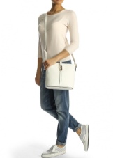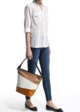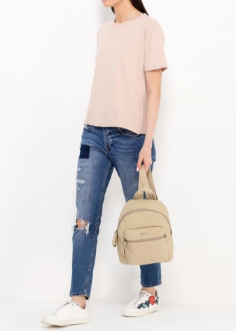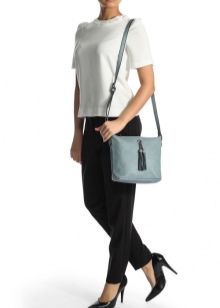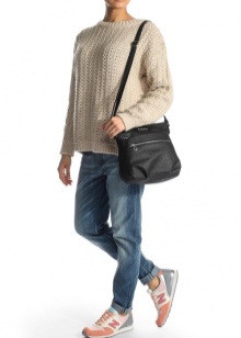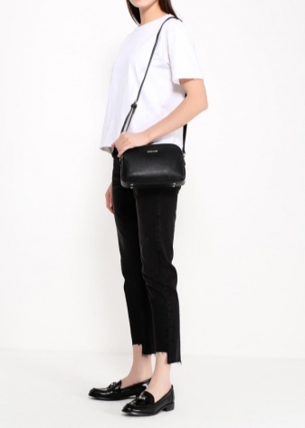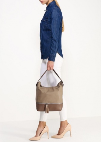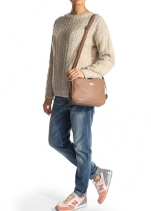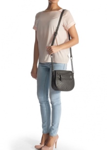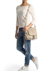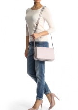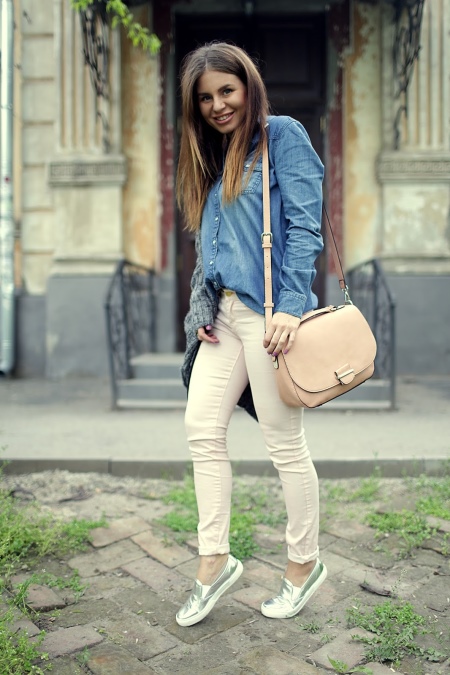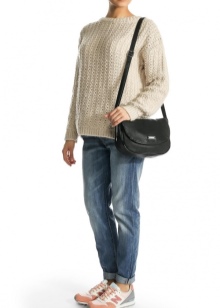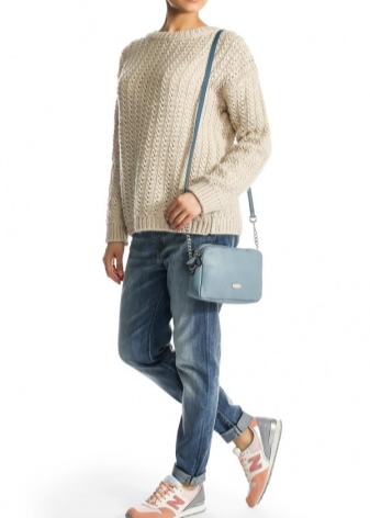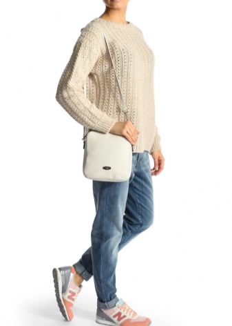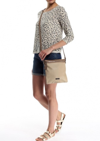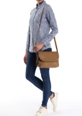 If you prefer an active lifestyle, then you should take a closer look at compact models with a long strap.Convenience and comfort come first, although the stylish design attracts the attention of many girls. The cream-colored model looks beautiful in an ensemble with beige jeans, a blue denim shirt and comfortable golden moccasins.
