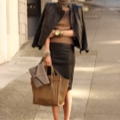 The bow of a busy business woman can be made up of a short black sheath dress with a wide brown belt at the waist, stylish shoes with a medium heel and a narrow nose. To bring harmony to the set will help a bag-bag made of leather with a similar pattern and shade of the belt.