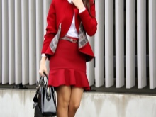 The image, created from a classic red jacket, trousers with arrows, a white top and white striped shoes with stiletto heels, will be decorated with a black bag with medium-sized handles, which allows carrying over the shoulder.