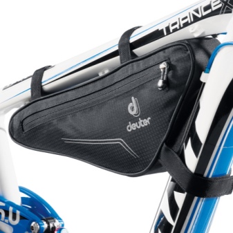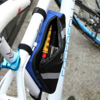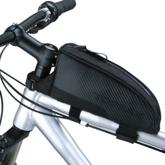 There are two types of such bags: triangular and on the frame. Triangular (subframe) are mounted under the frame. They come in different sizes, allowing you to transport both small items and long ones, such as skewers. There are small dimensions on the frame of the handbag. They are fastened with Velcro or straps.