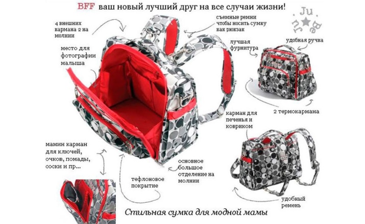 Young mothers can choose an accessory in bright colors with floral prints, polka dots, stripes, with a geometric pattern, with cartoonish images. And for those who love minimalism, models of calm shades, without drawings, have been created. All models have high-quality, beautiful fittings, zippers are easily unfastened with one hand. Numerous pockets carry not only a practical function, but also serve as an element of decor.