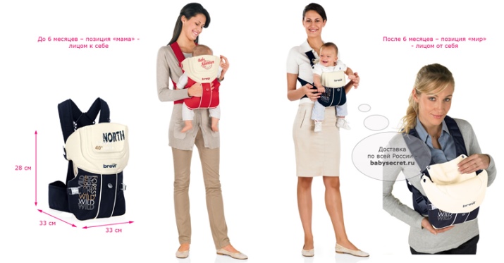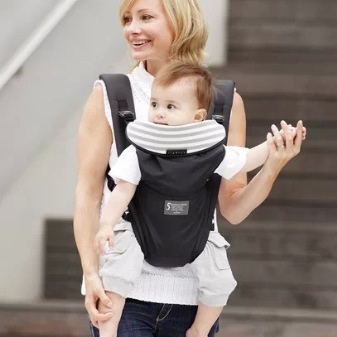 - There are also special models for babies from 6-7 months. Such a carrier is fixed in the area of the mother’s chest with fasteners, wide straps and carbines. It is from this age that you can turn to such backpacks in which the mother and child will be face to face.