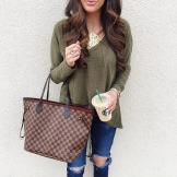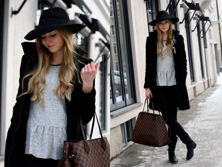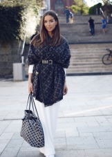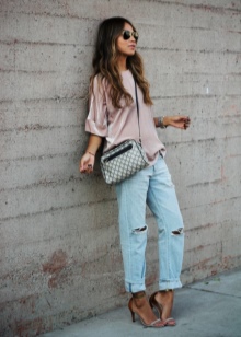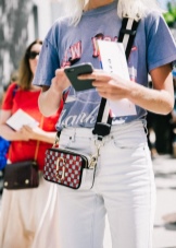 The accessory looks beautiful in a casual ensemble consisting of skinny jeans, a top, a T-shirt or a long-sleeve blouse. For such a kit, you can pick up both a bright handbag and a dark model. Choose products in which at least one color matches the color of your clothes.