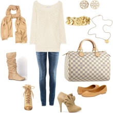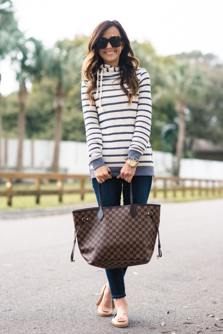 - To create a simple but stylish casual look, pick up skinny blue jeans, a black and white striped sweater, and beige ballet flats. You can decorate the ensemble with the help of a dark plaid bag and golden wristwatch.