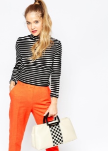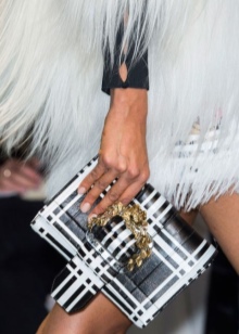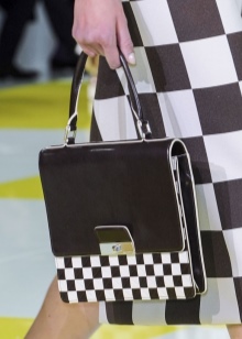 A stylish accessory can complement the business ensemble. To do this, it is better to pick up a bag of geometric shape with a dark cage. She will be in harmony with a pantsuit, straight trousers and a white shirt or a business dress with a white collar.