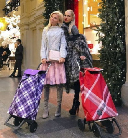 - You can also create a beautiful look with a shopping bag on wheels. Pick up a model with a red-white or violet-white cell. If the weather is chilly, put on a pale pink skirt to the knee, a light jacket or a warm sweater and complete the ensemble with suede gray boots with heels and a white clutch over your shoulder.