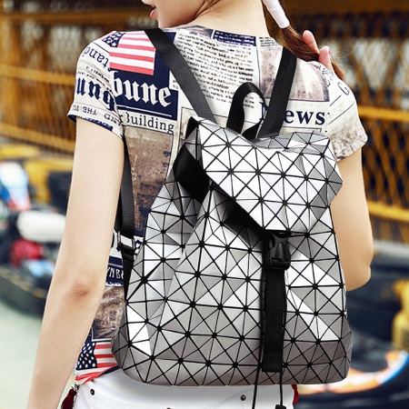 - You can complete a simple set of a light t-shirt with newspaper prints and white shorts with black rivets with a stylish futuristic checkered backpack. Comfortable sneakers or light sneakers can be worn on your feet.