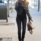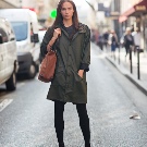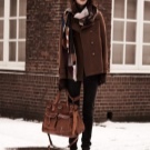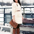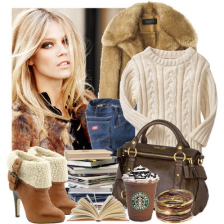 For cold weather, pick up a warm white knitted sweater, blue jeans, brown fur coat and heeled ankle boots in color. Complete the ensemble with dark brown hand luggage.