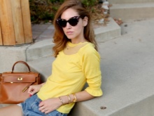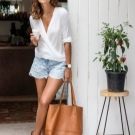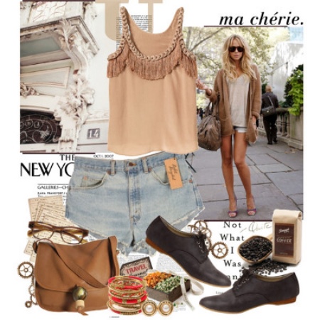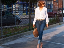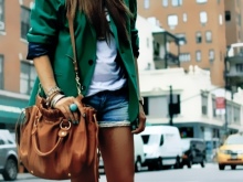 For hot summers, denim shorts with terry, a short beige topic and closed shoes with elongated noses are suitable. A ginger messenger bag with a long strap will harmonize with such things. You can dilute the image with sunglasses and ring bracelets.