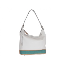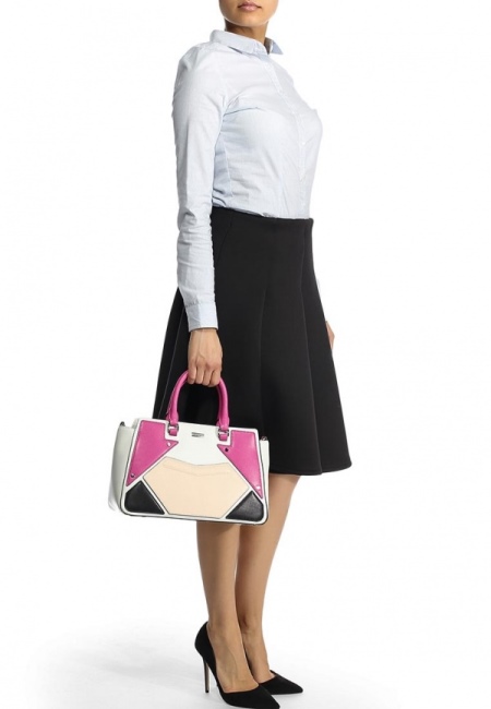 The bright base of the bag becomes softer with the addition of a wide light edging and narrow stripes framing several details. To draw attention to the light shade, designers decorate the edging with small sparkling rhinestones. The design of any bag is unique: the hand of a professional fashion designer is felt in it.