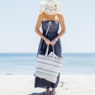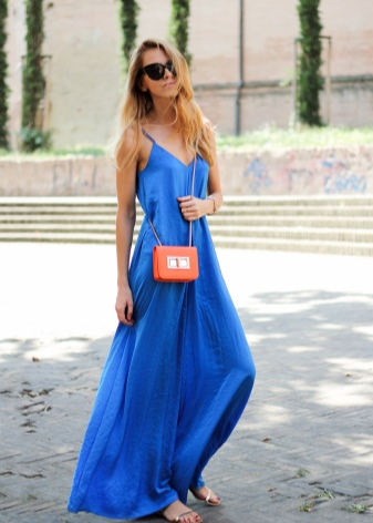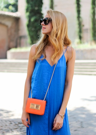A cobalt sundress on the floor can be supplemented with a bright orange bag on a chain, and get an incredibly spectacular summer look. For shoes, go for flat sandals and complete your look with stylish jewelry and sunglasses.