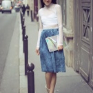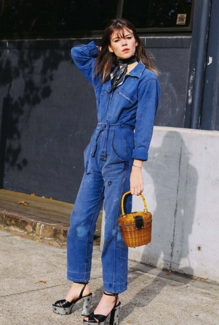 Denim romper jumpsuit is a great wardrobe item for all occasions. For example, it will look very impressive with platform sandals and a thick heel and a bag-basket. A silk scarf tied around the neck will help to give the image of French charm
