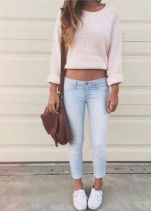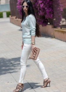 The ideal solution for every day is a white T-shirt, top or T-shirt with blue (or other color) jeans. Flared models are in fashion now, but boyfriends or cropped crop-jeans are also good. To not be hot, choose ripped jeans. Complete your look with flat shoes - sandals, ballet shoes, birken stocks.