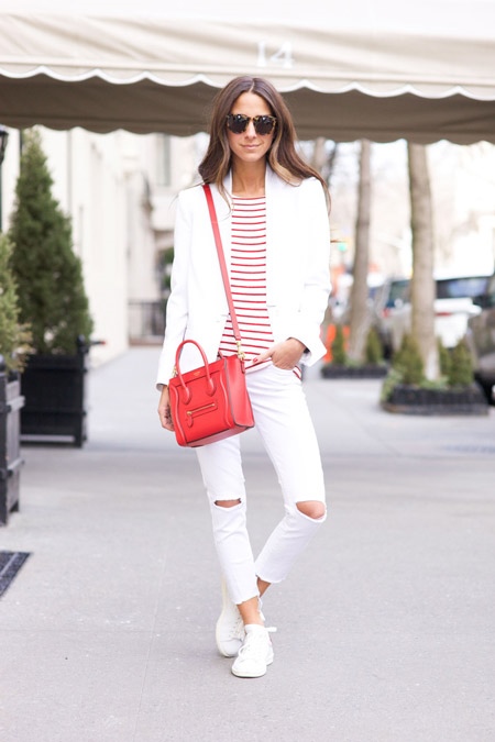 - A stylish casual look will turn out if you wear a striped top, white ripped jeans, a white jacket and light sneakers. Dilute this shining kit with a small red shoulder bag and sunglasses.