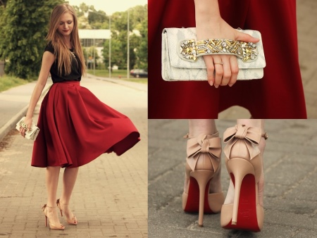 - A chic evening ensemble can be created with a black bodycon top, a burgundy burgundy skirt with a length just below the knee and beige high-heeled shoes and a platform. A white or cream clutch with diamond embroidery and a metallic insert with sparkles will complete the image.