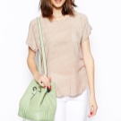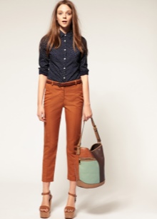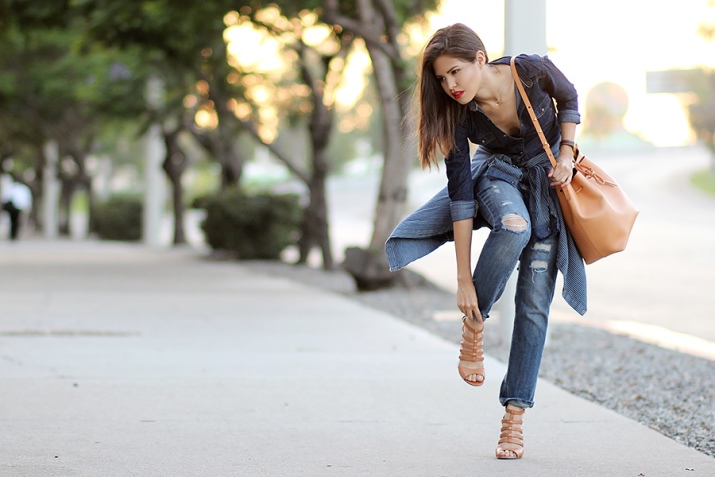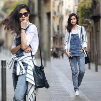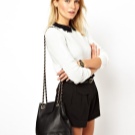 - Another suitable option for the summer would be denim shorts, complemented by contrasting tops or t-shirts. Against their background, not very large handbags in color will look great.