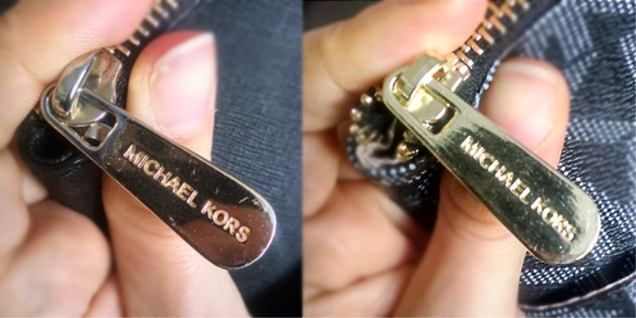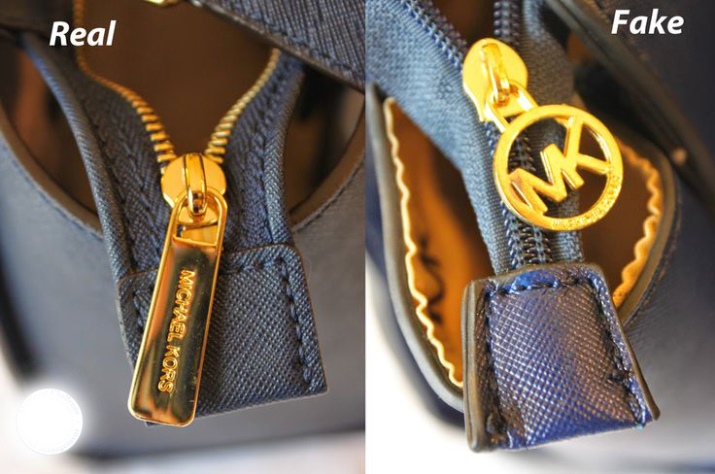 - Accessories and decorative elements. The lightning slider, even when first used in a store, moves smoothly and does not jam. The colors of the accessories can be of gold and silver shades, but devoid of excessive flashy shine. Also on the accessories of the original there is a laser engraving of the company logo, all letters of the logo are printed on one side and are clearly visible;