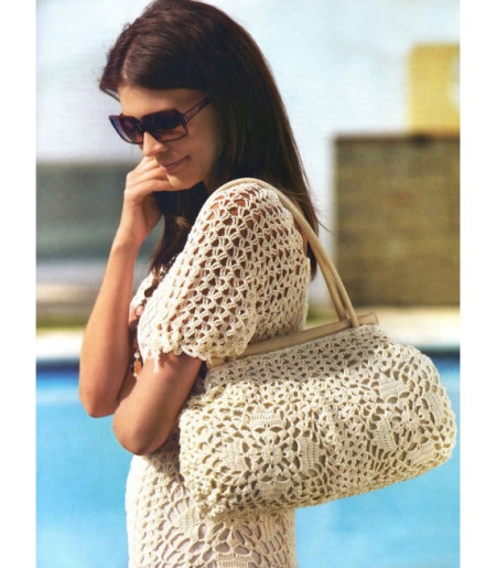 - But an example of a knitted bag is simple and at the same time very elegant. Large crochet makes things easy, and a delicate light beige color will emphasize even a small tan.
