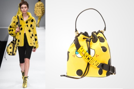 The 2014/2015 fall-winter ready-to-wear collection was partially dedicated to the SpongeBob cartoon. The assortment included a clutch bag, a bag-bag, a round crossbody bag and a roomy shopper bag. Each model is yellow, with a characteristic print and face of a popular cartoon character.