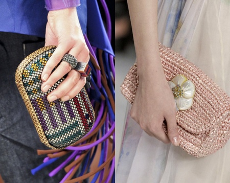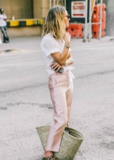 Summer trousers with topics or T-shirts are stylishly combined with a woven bulk bag or net with shortened straps, as well as a miniature clutch.