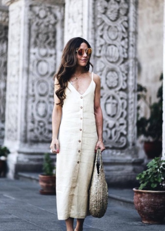 A beach bag, a bag-bag, a bag-sack perfectly match a sundress and give this style a feeling of lightness and weightlessness. From shoes suitable - sandals, sandals with heels, ballet shoes.