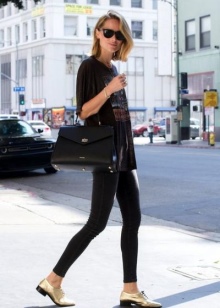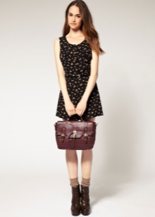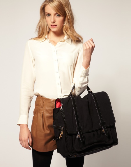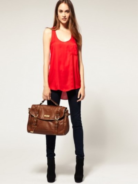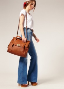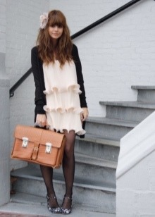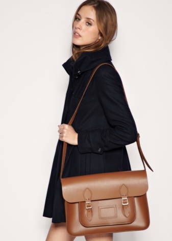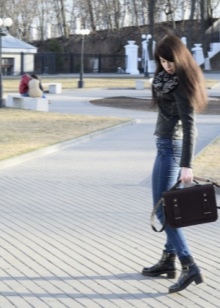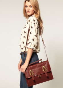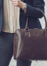 - A puffy briefcase with a short handle will look harmoniously in casual ensembles. Put on tight blue jeans or black leggings and complement them with a light contrasting shirt. Shoes should be selected in accordance with the season. A brown leather bag will complement this look.