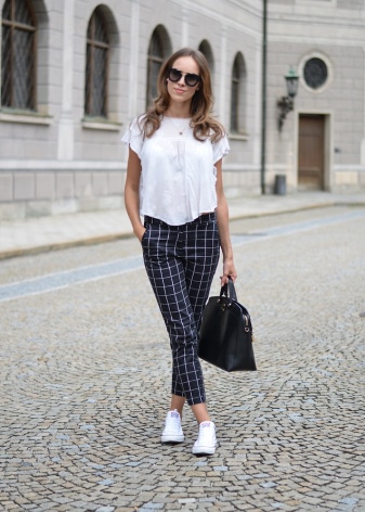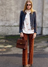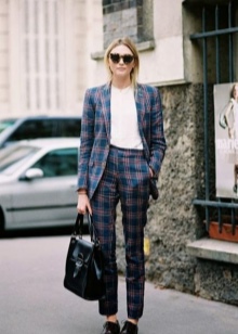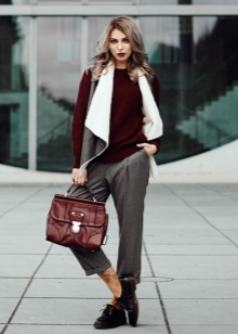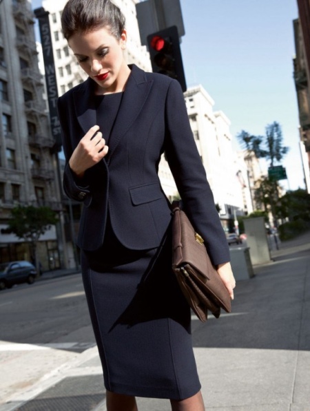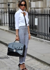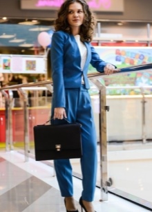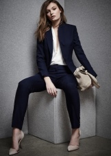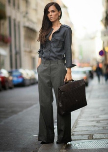 - The most successful is the combination of a business trouser suit and a briefcase in color. With such outfits, dark bags with hard frames look great. Shoes for such sets should be selected elegant and neat. For example, it can be pointed leather shoes with a thin heel.