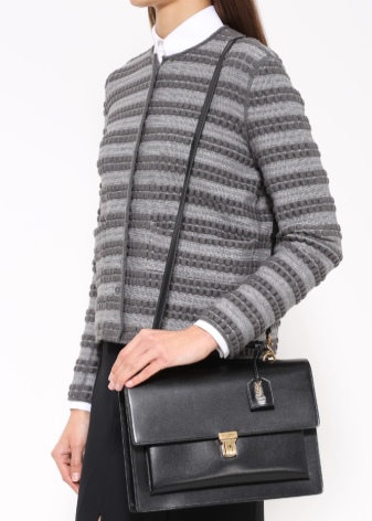 - A rectangular briefcase with short handles will harmoniously look with a business ensemble of a black jacket and a black skirt above the knee. A white blouse or dress shirt can be worn underneath, and black leather shoes with a small heel can be put on.