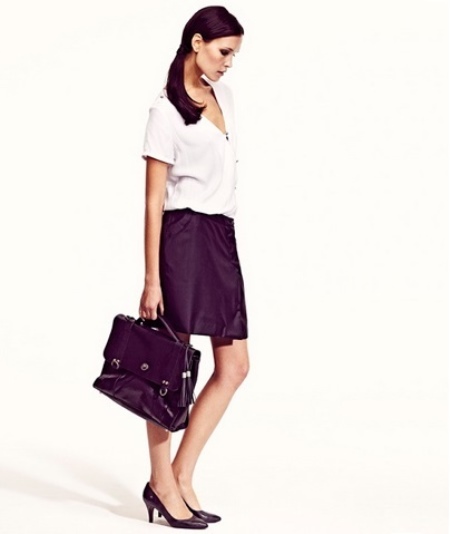 - The most common ensemble of a white blouse and a black pencil skirt looks great if complemented by a dark leather briefcase.