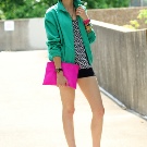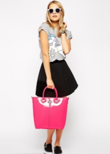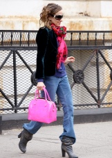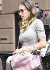 - Very fond of bright pink bags, actress Sarah Jessica Parker. She takes a large model with her for business and shopping trips. With a bright and colorful thing, she wears blue jeans and a plain gray t-shirt. If this is an evening out, then Sarah combines the accessory with a burgundy dress, a white jacket and elegant black shoes.