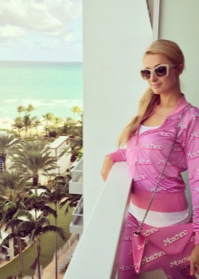 - A big lover of pink is Paris Hilton. She adorns many outfits with colorful handbags of various sizes. Not so long ago, in her Instagram star posted a photo where she stands on the balcony in a bright pink blouse with Moschino inscriptions and similar loose-fitting pants. Paris completed this set with a clutch-envelope on a chain-strap, executed in the same style as her clothes.