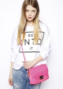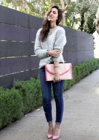 - A flirty bag will fit into city bows, gathered from skinny jeans, light tops, t-shirts or sweaters and pointed pink boat shoes. Ideally in such a kit, a handbag would look that would fit the shoes as much as possible in color.