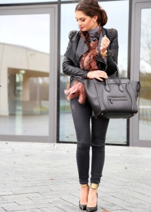 The brown leather product will look harmoniously in a country look with classic blue jeans or a full skirt, shirt and boots. For a glamorous trend, you can use skinny trousers and jeans, shiny blouses and tops, jackets, or add rock with leather jackets.