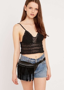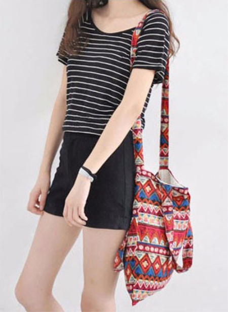 A set consisting of black high-waisted shorts, a striped T-shirt and a shoulder bag with ethnic motifs or geometric patterns on a long strap will look simple and tasteful. You can wear sneakers or sneakers to match. Such an ensemble is recommended only to young and slender girls.