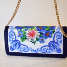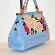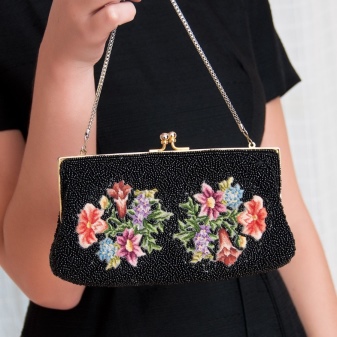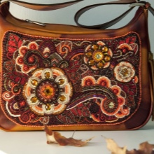 For example, a blue suede handbag will be an excellent base for embroidery in soft pink and green colors. An orange accessory will effectively decorate purple and green beads; for a pink handbag, embroidery in purple, turquoise, white or black is suitable.