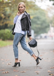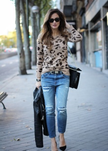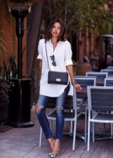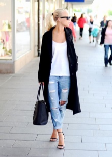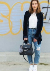 - If it's hot summer outside, you can well dress up in short jeans shorts and a loose shirt. Complement your tandem with comfortable sneakers or sandals, as well as a fixed black handbag.