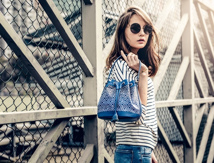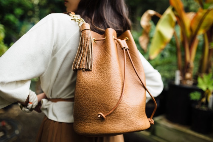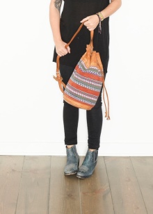 The open top is equipped with laces or braided ties made of different materials. With these parts, you can close your bag. To do this, you only need to tighten the laces in the knot. Similar models are equipped with one shoulder handle, but some products have additional straps for socks on the back. The second option is very similar to leather backpacks and pouches. Such copies are released by the famous brand Mango.
